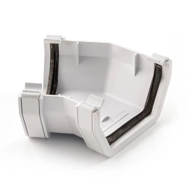 White square section uPVC guttering. Nominal size of gutter 112 mm wide x 65 mm deep. Downpipes 65 mm square.
