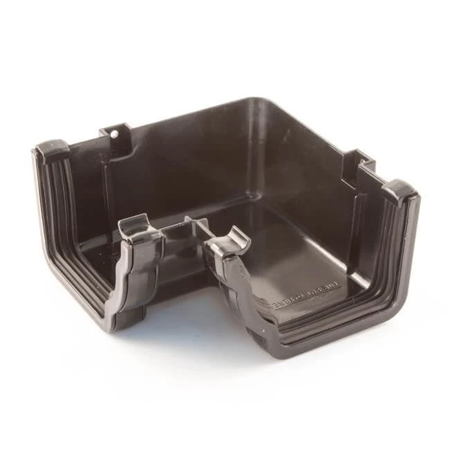 Black uPVC high capacity guttering. Nominal size of gutter 117 mm wide 75 mm deep. for downpipe use 65 mm square pipe and fittings.