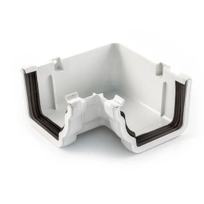 White uPVC high capacity guttering. Nominal size of gutter 117 mm wide 75 mm deep. for downpipe use 65 mm square pipe and fittings.
