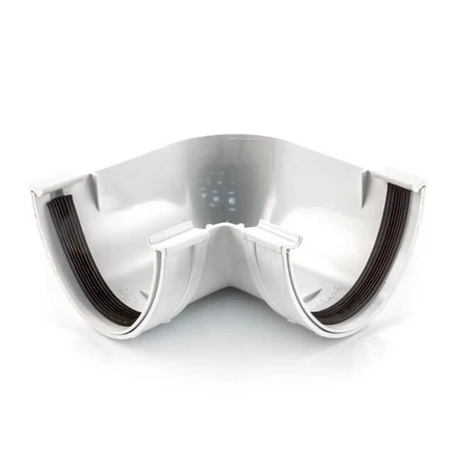 White uPVC guttering. Nominal size of gutter 117 mm wide x 75 mm deep. for downpipe use 68 mm round pipe and fittings.