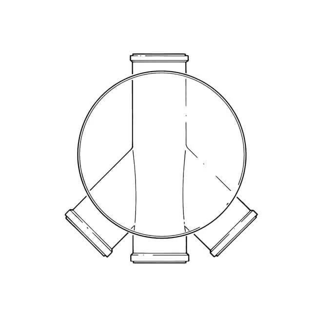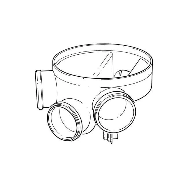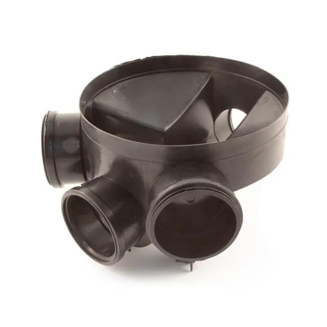 320 mm diameter, black. 2 x 45° side branch inlets. Sockets include captive ring seal for chamfered plain end pipe. Depth should NOT exceed 600 mm.