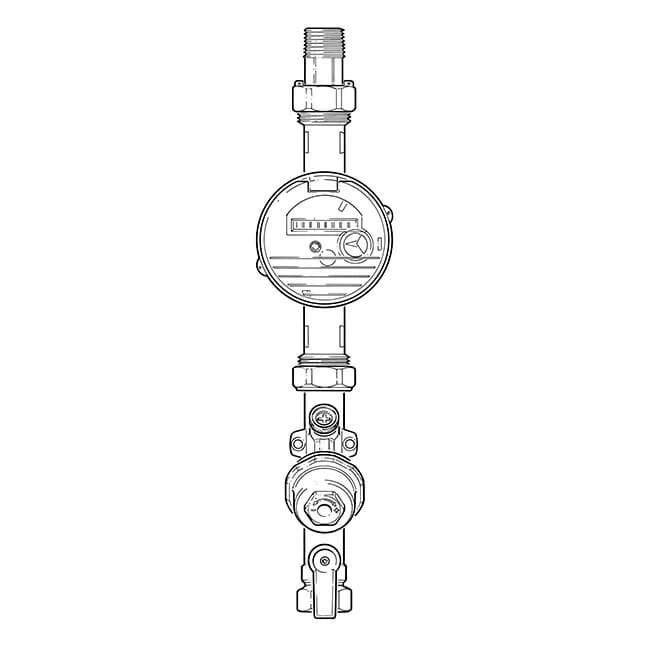 Altecnic apartment control with monobloc style valve assembly and cold water meter. Allows monitoring and control of the water supply in multi-occupancy buildings. The assembly consists of a PRV with tamper proof cover, single check valve, gauge port and strainer.