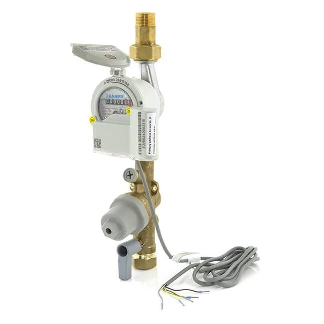 Altecnic apartment control with monobloc style valve assembly and hot water meter. Allows monitoring and control of the water supply in multi-occupancy buildings. The assembly consists of a PRV with tamper proof cover, single check valve, gauge port and strainer.