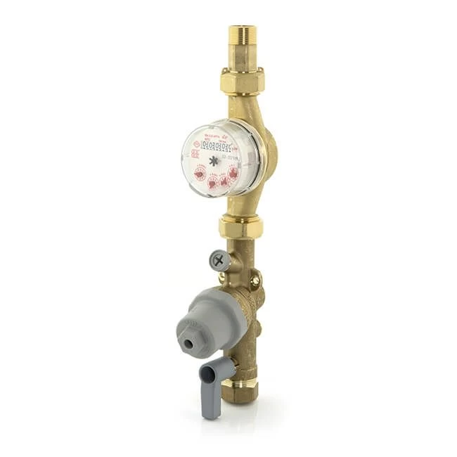 Altecnic apartment control with monobloc style valve assembly and hot water meter. Allows monitoring and control of the water supply in multi-occupancy buildings. The assembly consists of a PRV with tamper proof cover, single check valve, gauge port and strainer.