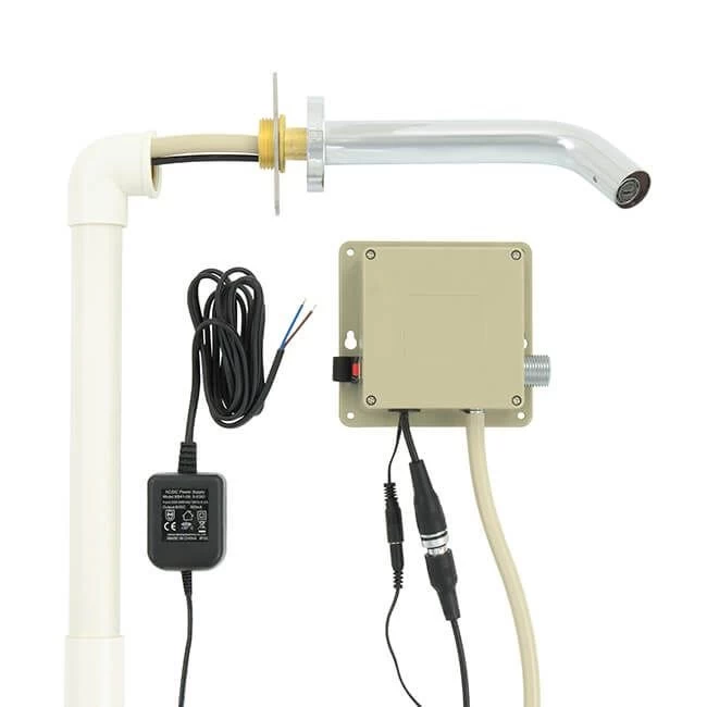 Infrared brass body chrome plated angled tap with sensor built into the wall mounted spout outlet and remote control box with solenoid valve.