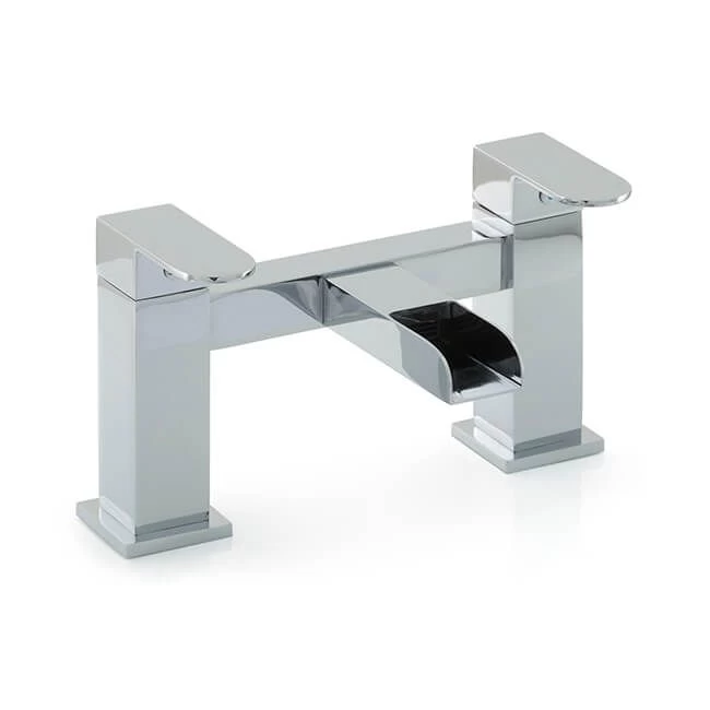 Bath tap deck filler with waterfall tap, chrome plated brass body, square filler head and 1/4 turn lever handles.
