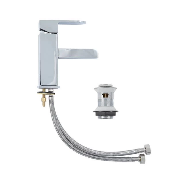 Monobloc lever handle basin mixer with waterfall tap, chrome plated brass body, 35 mm ceramic cartridge, flexible tap connectors and clicker waste.