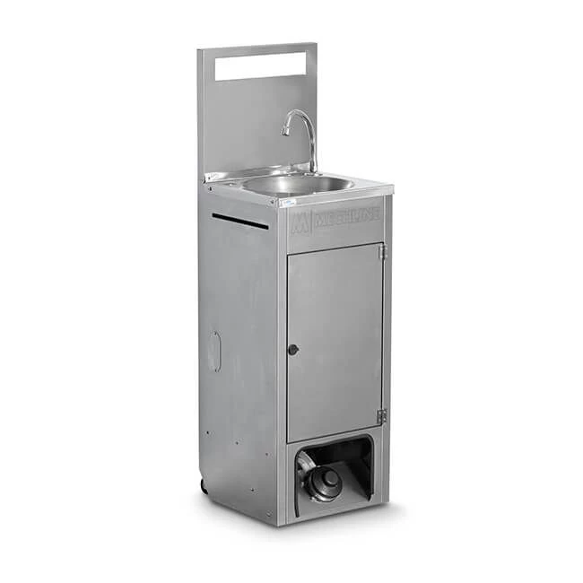 Handwash station manufactured from stainless steel includes spout with water saving difuser, foot operated valve, splashback, hinged door for storage and services access and castors for ease of movement.