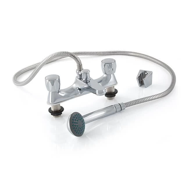 Contract bath mixer with chrome plated brass body and full turn metal heads. Supplied with shower hose, shower head and wall bracket.