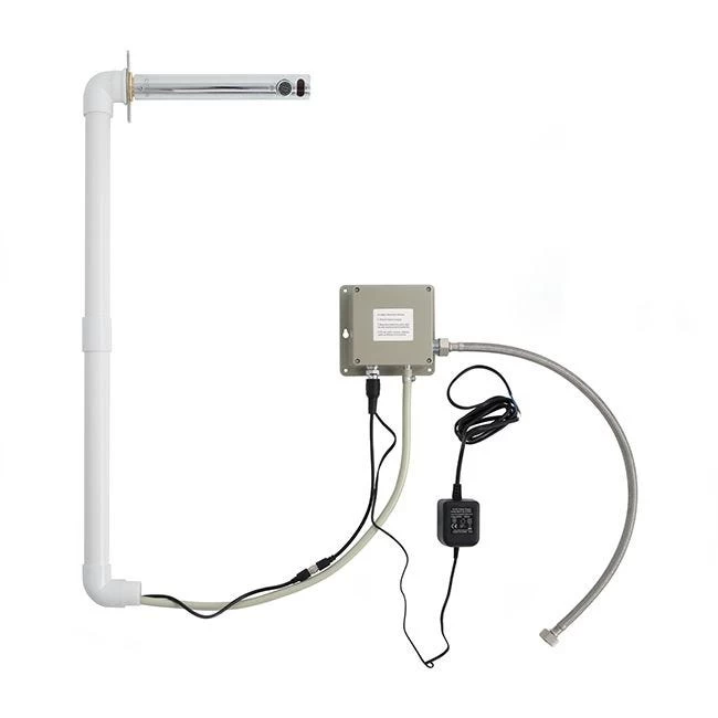 Infrared brass body chrome plated tap with sensor built into the wall mounted spout outlet, remote control box with solenoid valve and flexible inlet connector hose. Battery and mains power options, 4 x AA alkaline batteries (not supplied) or 230 V AC transformer.
