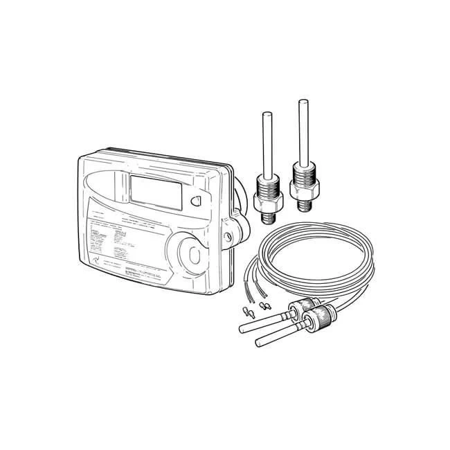 The heat/energy meter kit consists of an integrator, two temperature sensors and immersion pockets. A pulsed hot water meter (to be purchased separately) is installed in the flow or return pipe and counts the volume of water. Signals from the flow meter and the sensors are transferred to the integrator, which is designed to calculate the consumption of heat/energy in power networks from 100 W to 30 MW, where water is the heating or cooling medium.