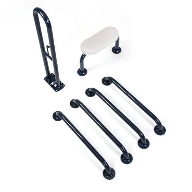 Doc M rail upgrade kits incorporating a friction hinged arm with 870 mm projection, four 600 mm x 32 mm grab rails and back rest rail with pad.