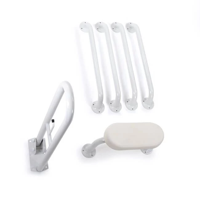 Doc M rail upgrade kits incorporating a friction hinged arm with 870 mm projection, four 600 mm x 32 mm grab rails and back rest rail with pad.