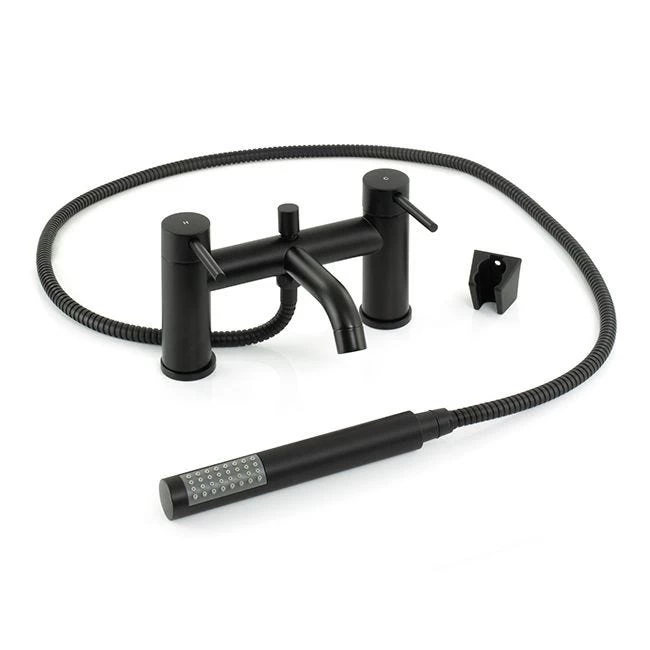 Bath shower mixer with matt black brass body, 1/4 turn ceramic cartridge and lever handles. Supplied with shower hose, shower head and wall bracket.