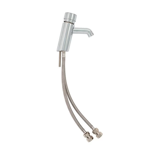 Chrome basin tap. Brass body, zinc handle, non concussive thermostatic valve and adjustable shut off time (6 to 12 seconds). Supplied with flexible tap connectors.