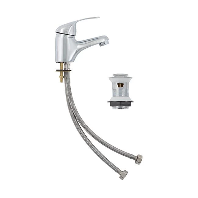 Monobloc basin mixer with chrome plated brass body, 40 mm ceramic cartridge, lever head, flexible tap connectors and clicker waste.