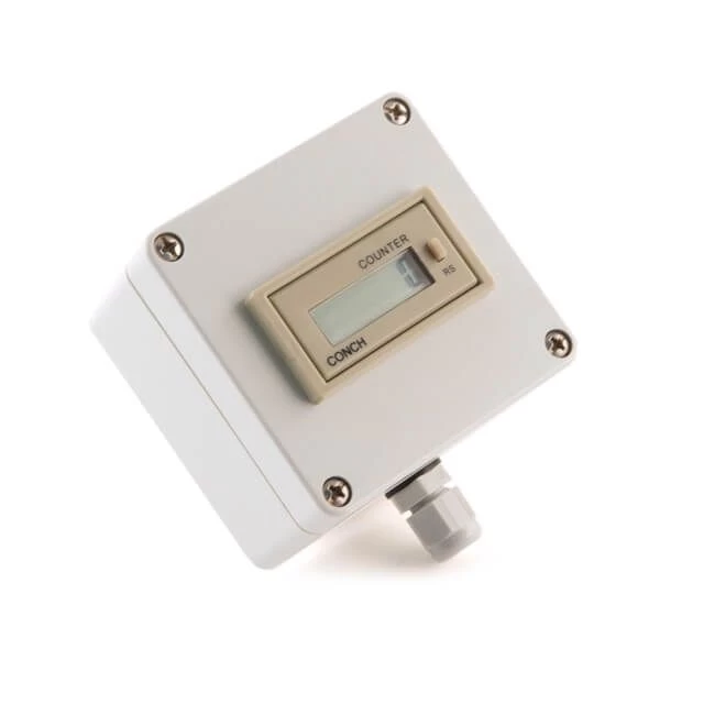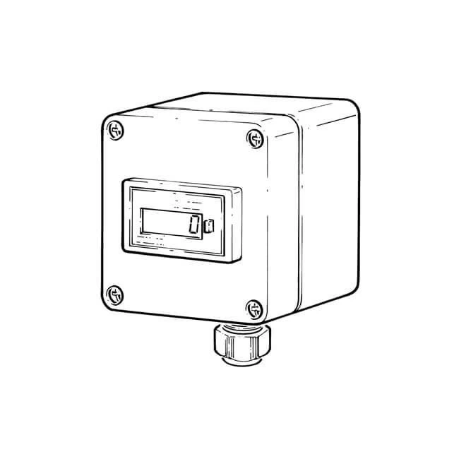 The remote display unit comprises a counter housed in an IP65 rated, wall mounting ABS enclosure fitted with a cable gland. The counter is self powered and is operated by the proximity or reed switch in the meter to which the counter is connected. The counter can be operated with or without a remote re-set function.