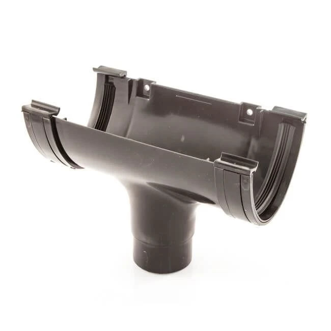 Black uPVC guttering. Nominal size of gutter 117 mm wide x 75 mm deep. for downpipe use 68 mm round pipe and fittings.