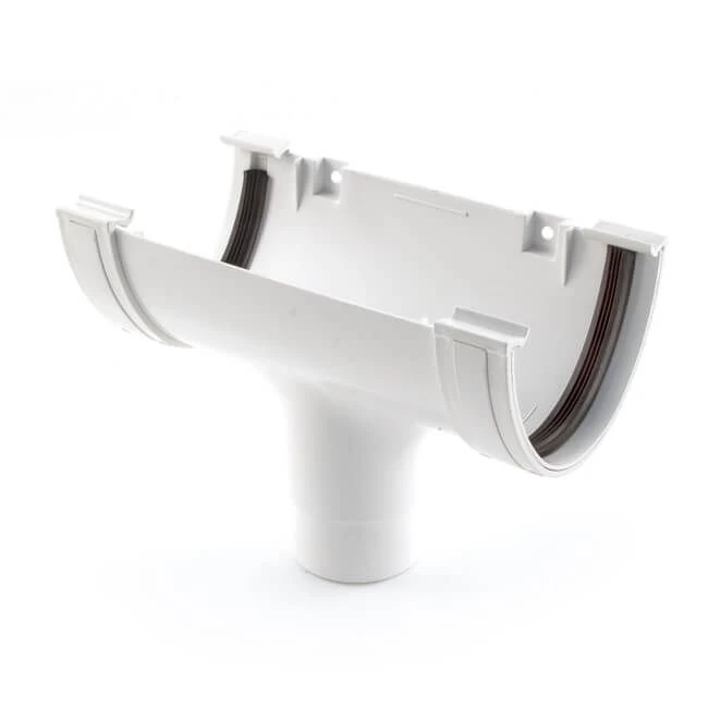 White uPVC guttering. Nominal size of gutter 117 mm wide x 75 mm deep. for downpipe use 68 mm round pipe and fittings.
