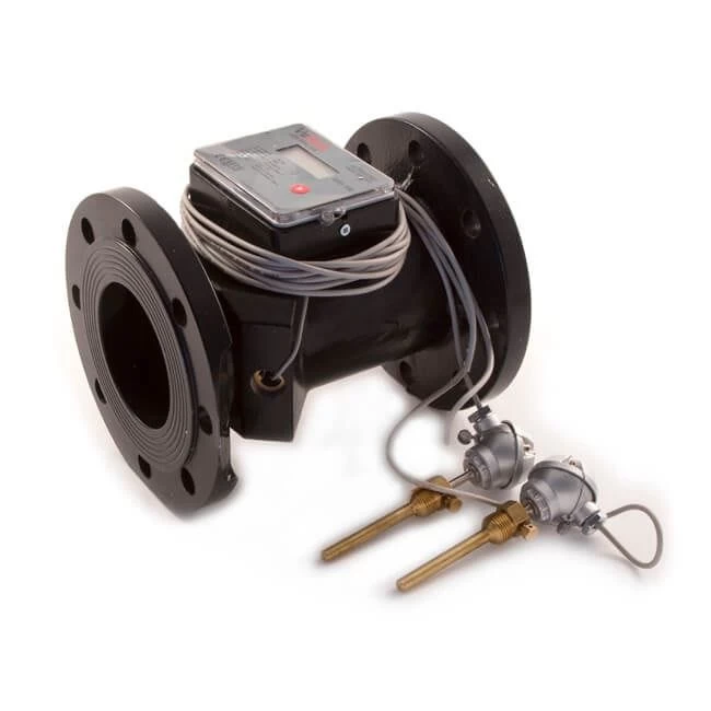 The VHU Ultrasonic heat meter has a dismountable LCD unit, M-Bus communications interface, sensor body with PN16 flanged connections, M-bus cable and two matched temperature sensors, for water-based systems with temperatures from 5 to 90°C.
