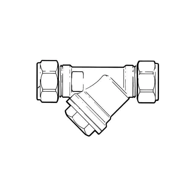 Strainer with stainless steel mesh to catch particles. Filter mesh may be cleaned without removing strainer from pipeline. 22 mm x 22 mm compression Y in-line strainer
